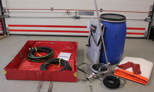 Bindemittel, Streuwagen, Schuttmulde, Besen und Schaufel